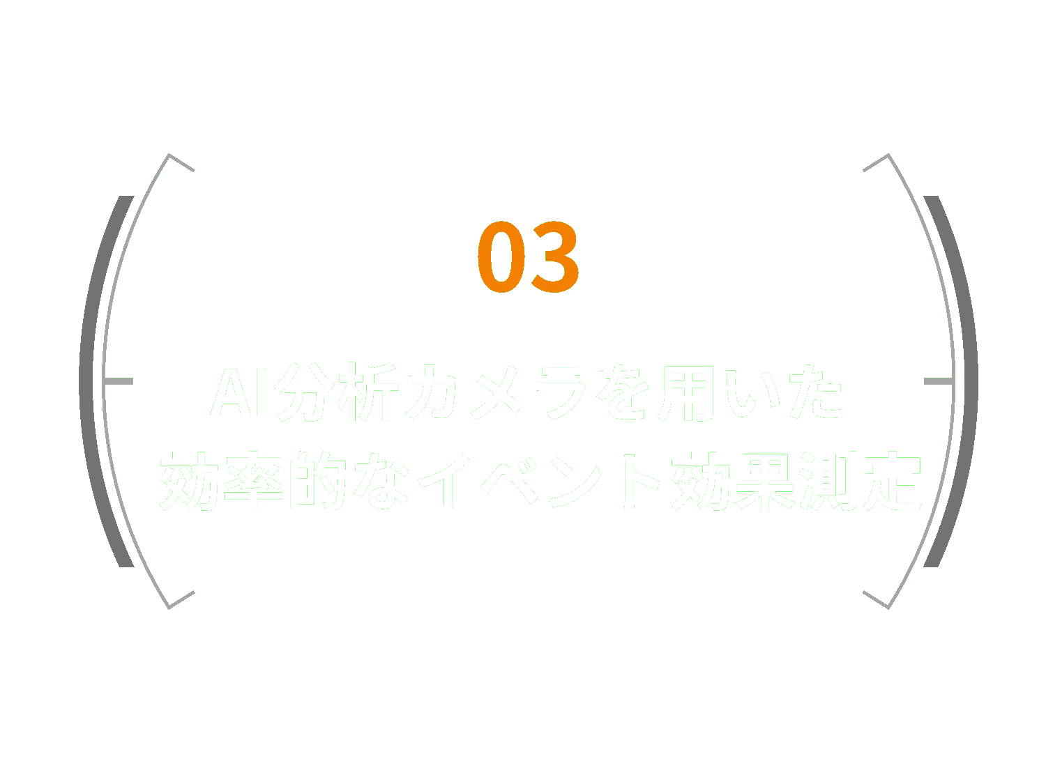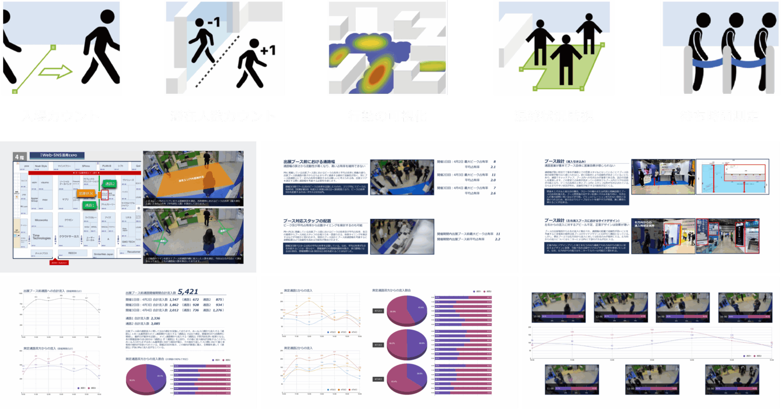 本サービスではAI分析カメラを出展ブースに設置し、自動でデータを収集。滞在人数や入退場数のカウント、滞在時間に応じたブース内状況の可視化、混雑状況の監視、特定コンテンツにおける待ち時間の測定が可能です。弊社分析のスペシャリストによって測定内容をレポート化してご提供しますのでイベント出展におけるご担当者様の社内報告のご負担を軽減、次回出展時における計画的かつ効果的なブース戦略の参考にしていただけます。