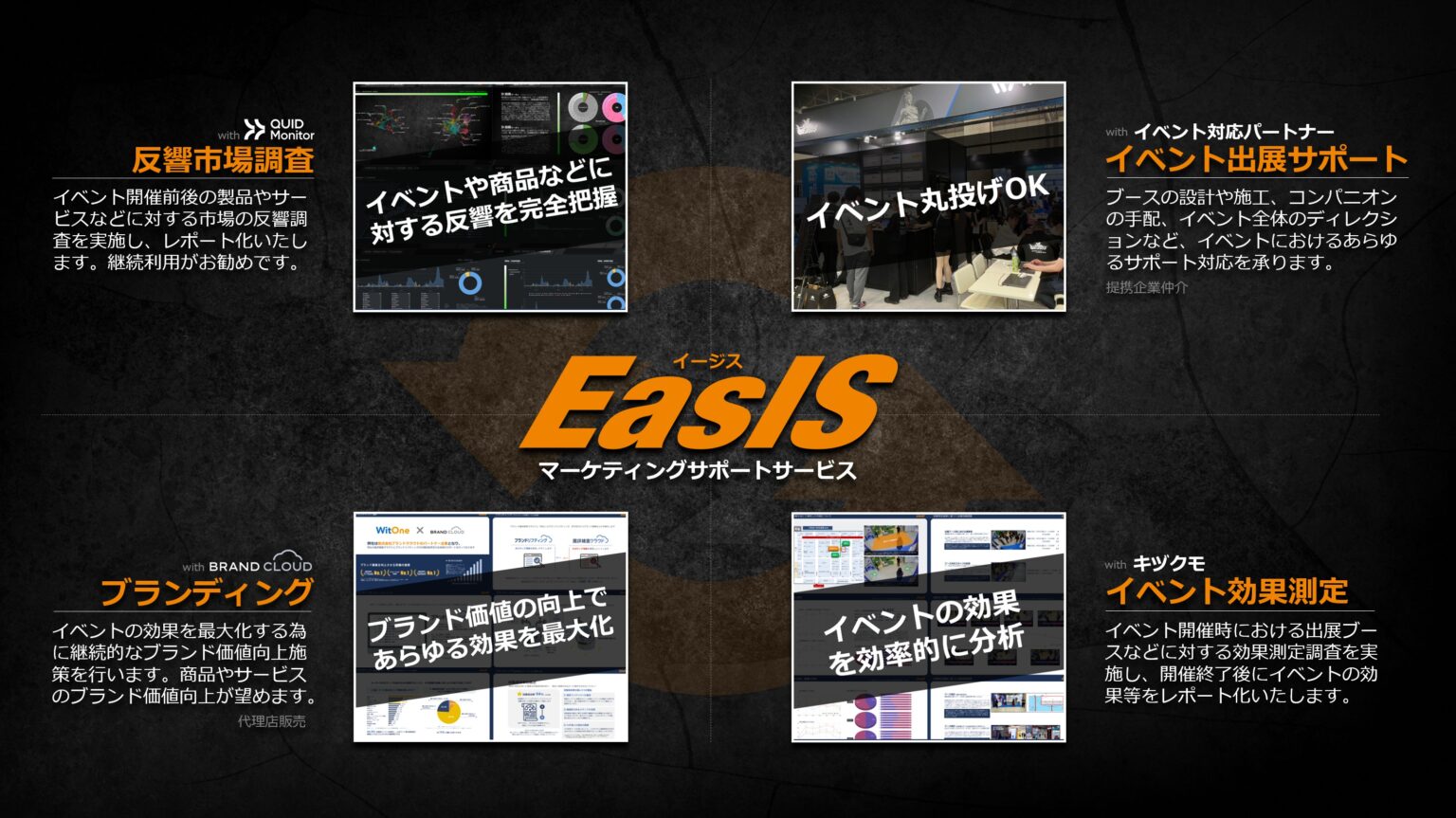 4つのサービスを展開することでイベントと連動させて商品やサービスにおける市場の状況を把握、ブランド価値を向上させる包括的なコンサル対応を実現します。この4つのサービスを総じてマーケティングサポートサービス「EasIS」と定義しています。