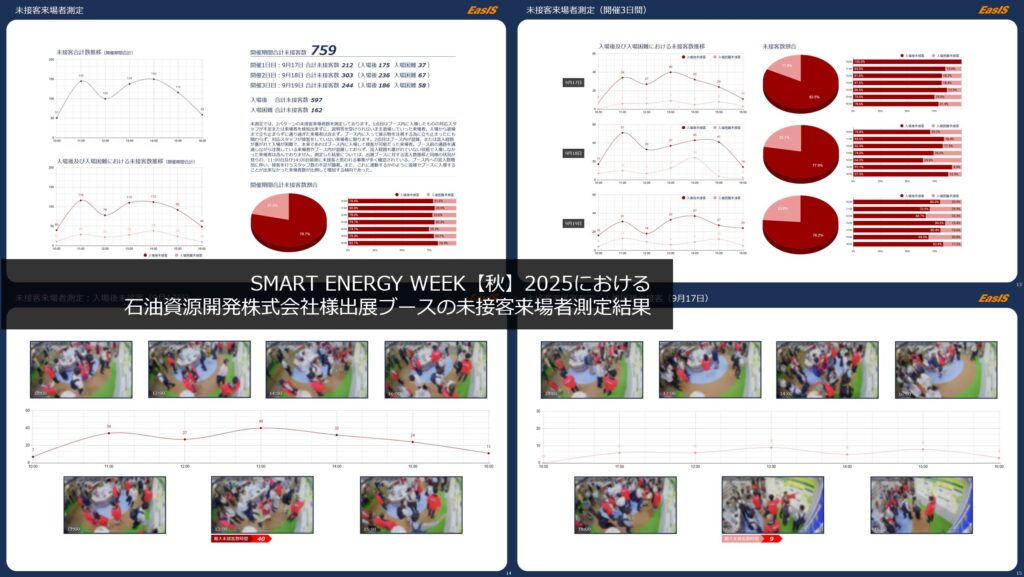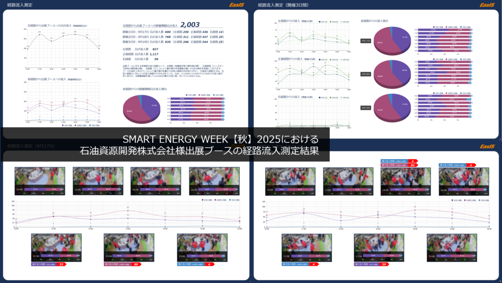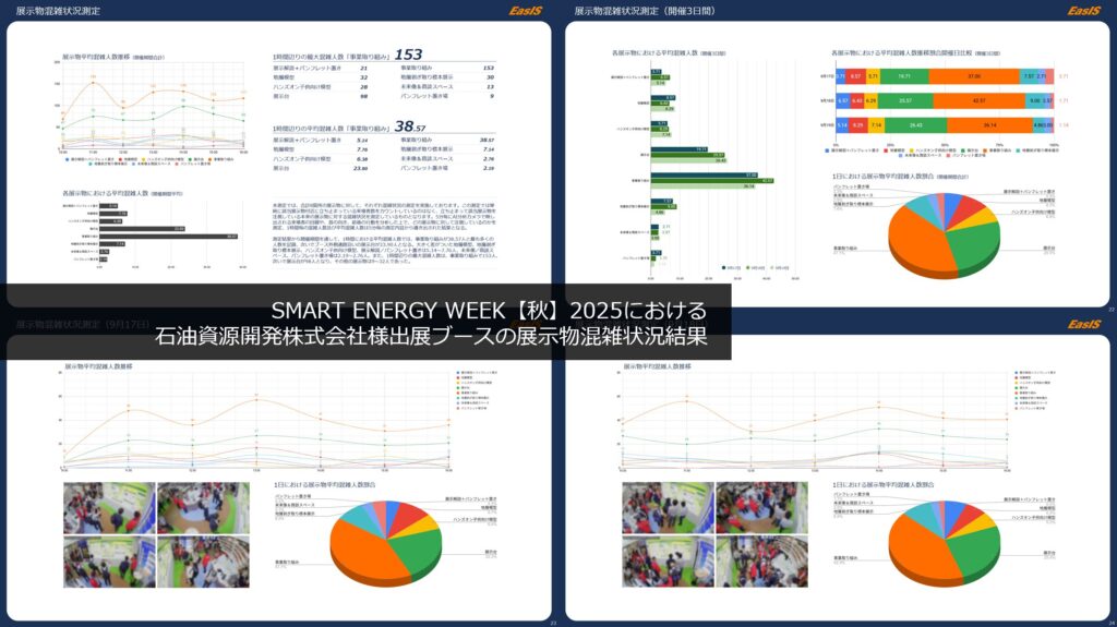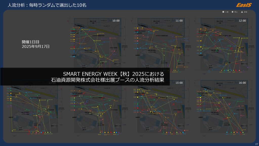 事前検討では、出展ブースの中が滞留しがちになるのではないかと危惧しており、どの部分で流れが悪くなるのか、どの展示が集客力があるのか見たかったのですが、ちょっと想定以上にブースが混在していて、ブース内に人が溢れかえっている状態で人流分析というのは難しい課題だったと感じています。状況を考えると致し方なかったのかなと思いますし、もう少し広い視点で、例えば我々のブースだけを見るのではなく会場全体見る場合には適している分析だと思いましたが、小さな視点での分析依頼には適さなかったのかなと感じています。