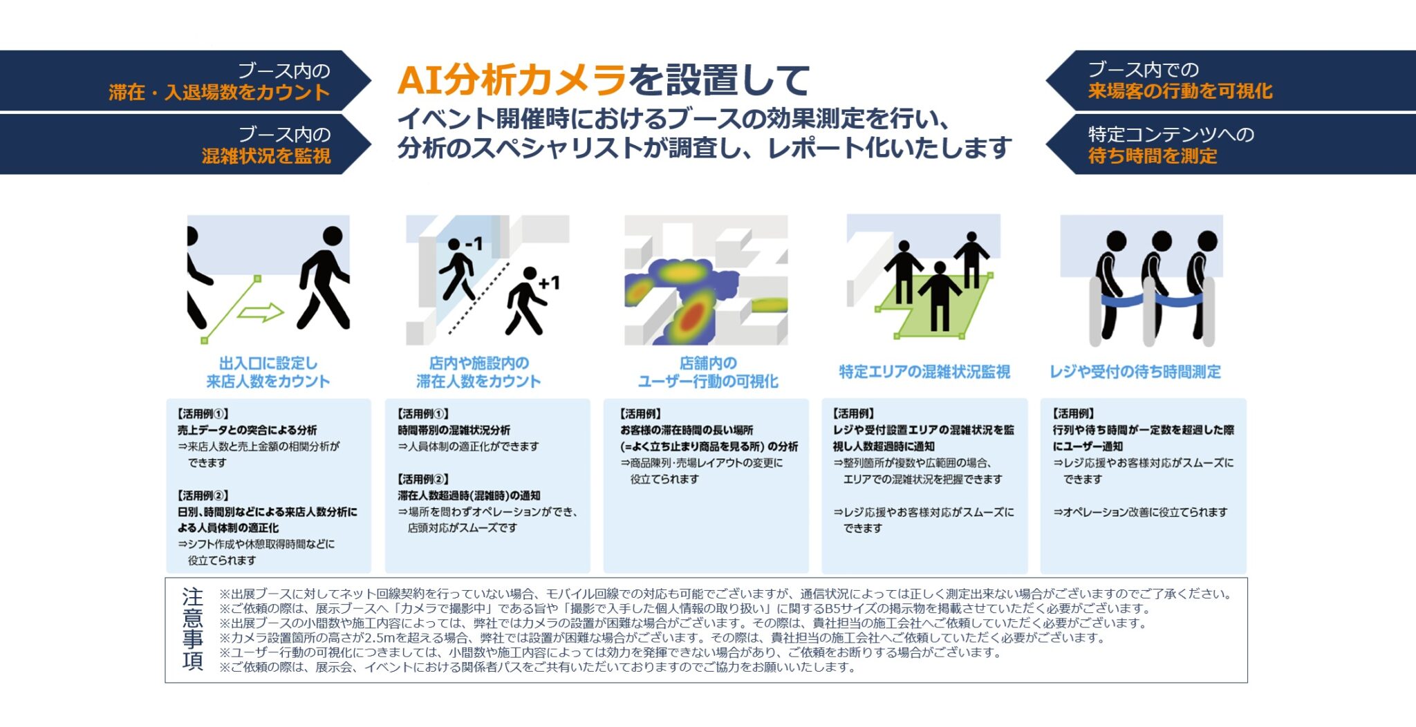 自動測定されたデータと分析スタッフによって、イベント終了後にご依頼を承ったイベントに関する分析、改善提案等を取り纏めてレポート化