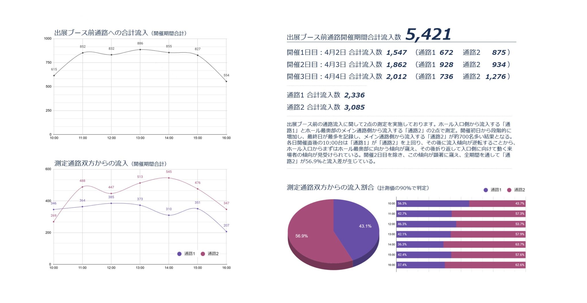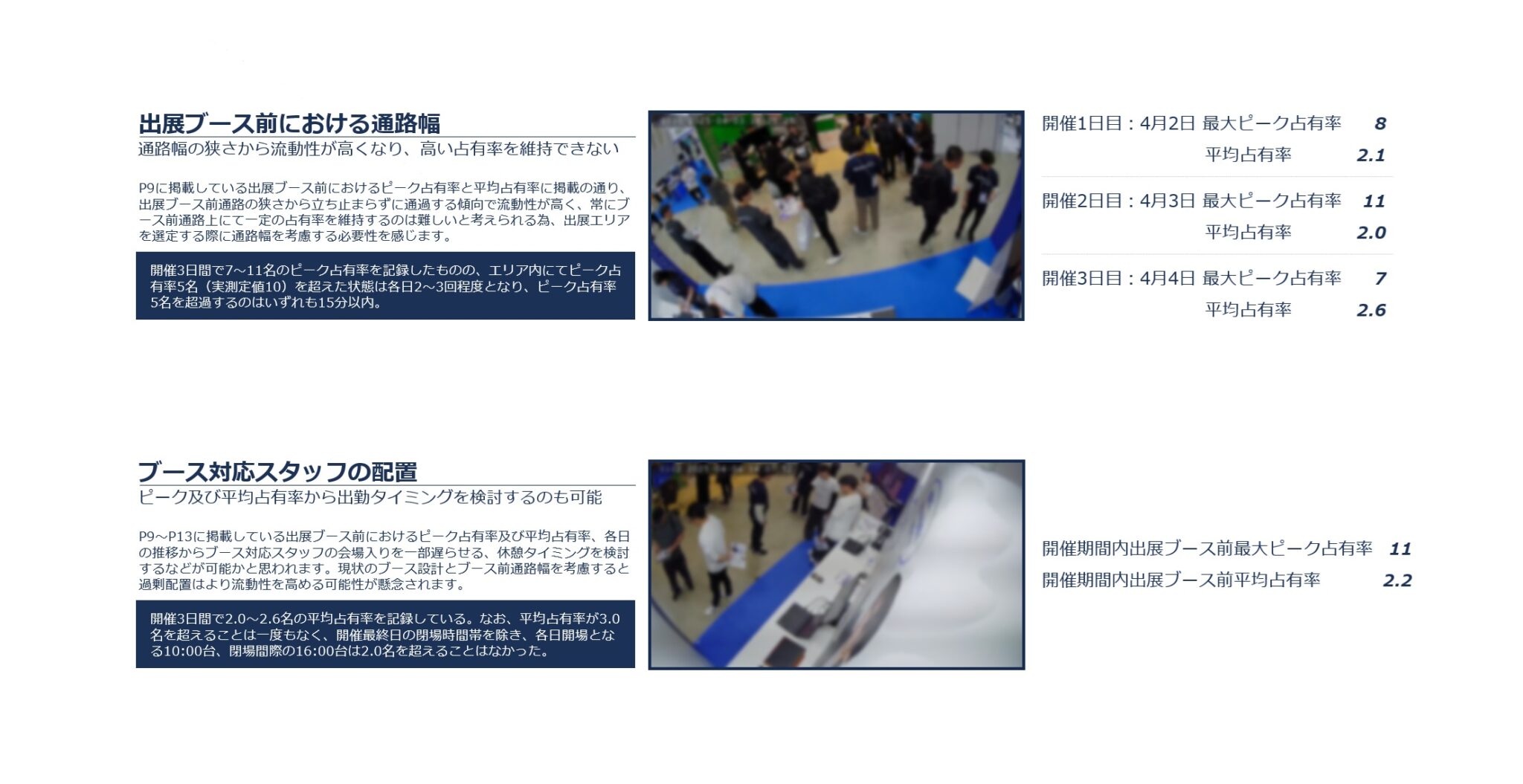 掲載内容はブース内占有面積が少なかったことから通路をメインとして、流入数と占有率を測定しております。