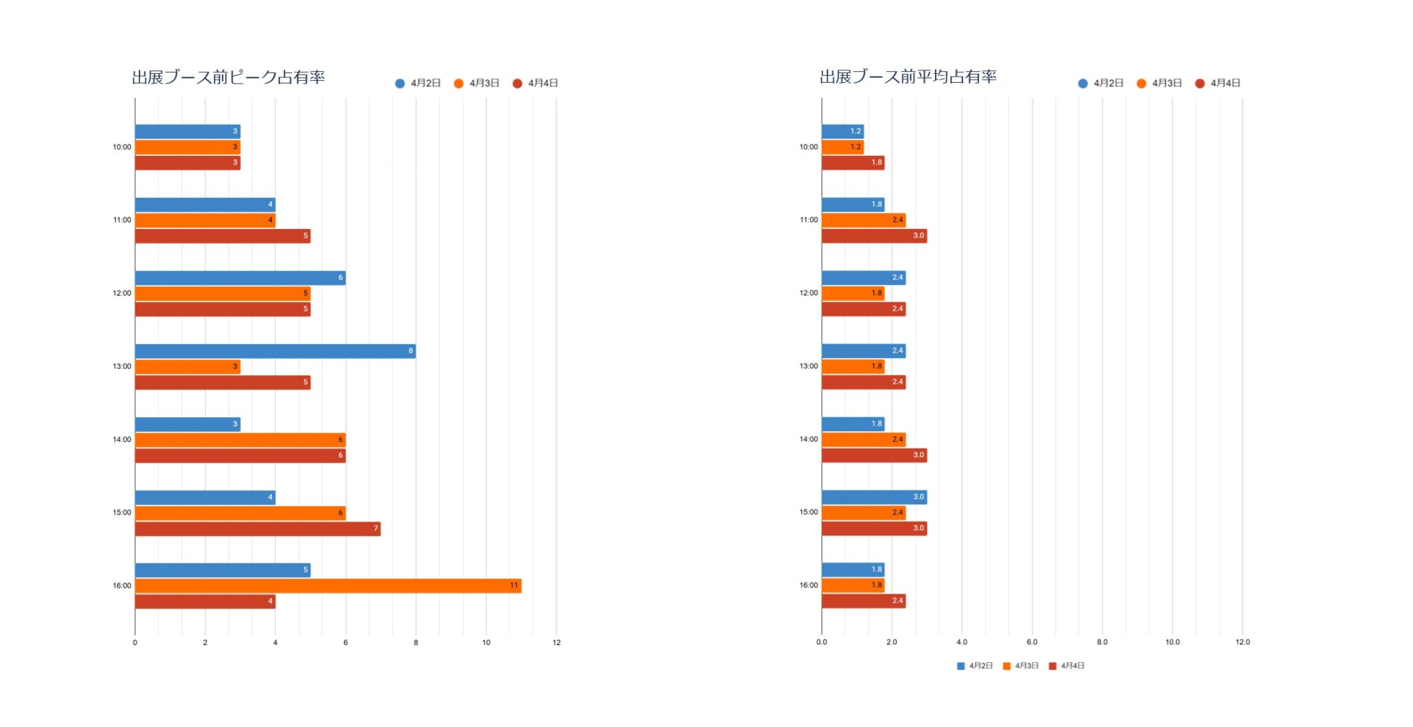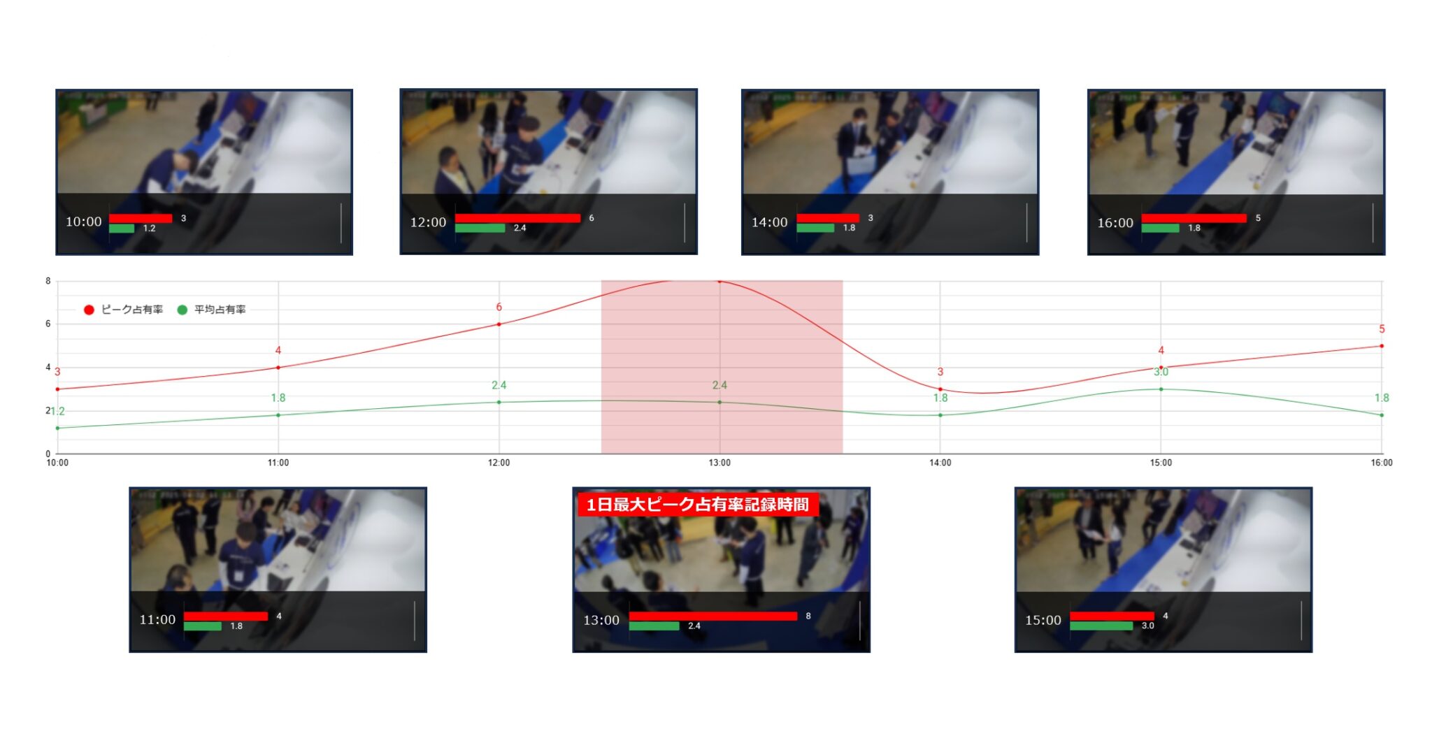 開催日毎の時間別ピーク占有率や平均占有率推移を掲載しております。