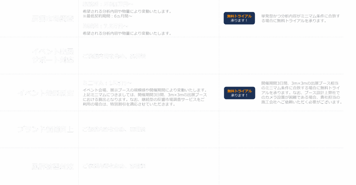反響市場調査は、継続型で月額 5万円 から毎週レポートをご提供可能です。お客様のご要望に応じて柔軟に内容を変更することが可能となりますが、内容によって価格が変動いたします。また、調査言語圏や内容によっては、各国ネイティブスタッフによる本格的な調査が必要になります為、費用は大きく変動することになります。また、イベント効果測定につきましては、イベントの開催期間や出展ブースの大きさなどによって変動いたしますがミニマムで 15万円 から対応可能です。現在、反響市場調査やイベント効果測定の 無料トライアル でのご提供も可能ですのでまずは、気軽にお問い合わせください。